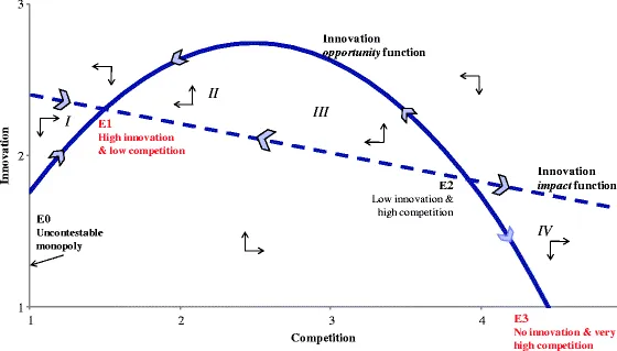 熊彼特认为创新需要市场力量,因为当企业有了市场力量,就可以赚取大量的利润,就可以规划长远,而竞争会削弱创新;但是肯尼斯·阿罗则认为竞争者更有创新动力,因为垄断者创新经常会得不偿失——自己成功了,也不过是原地踏步,即便是失败了,如果竞争者没有成功的话,依然保有垄断地位。