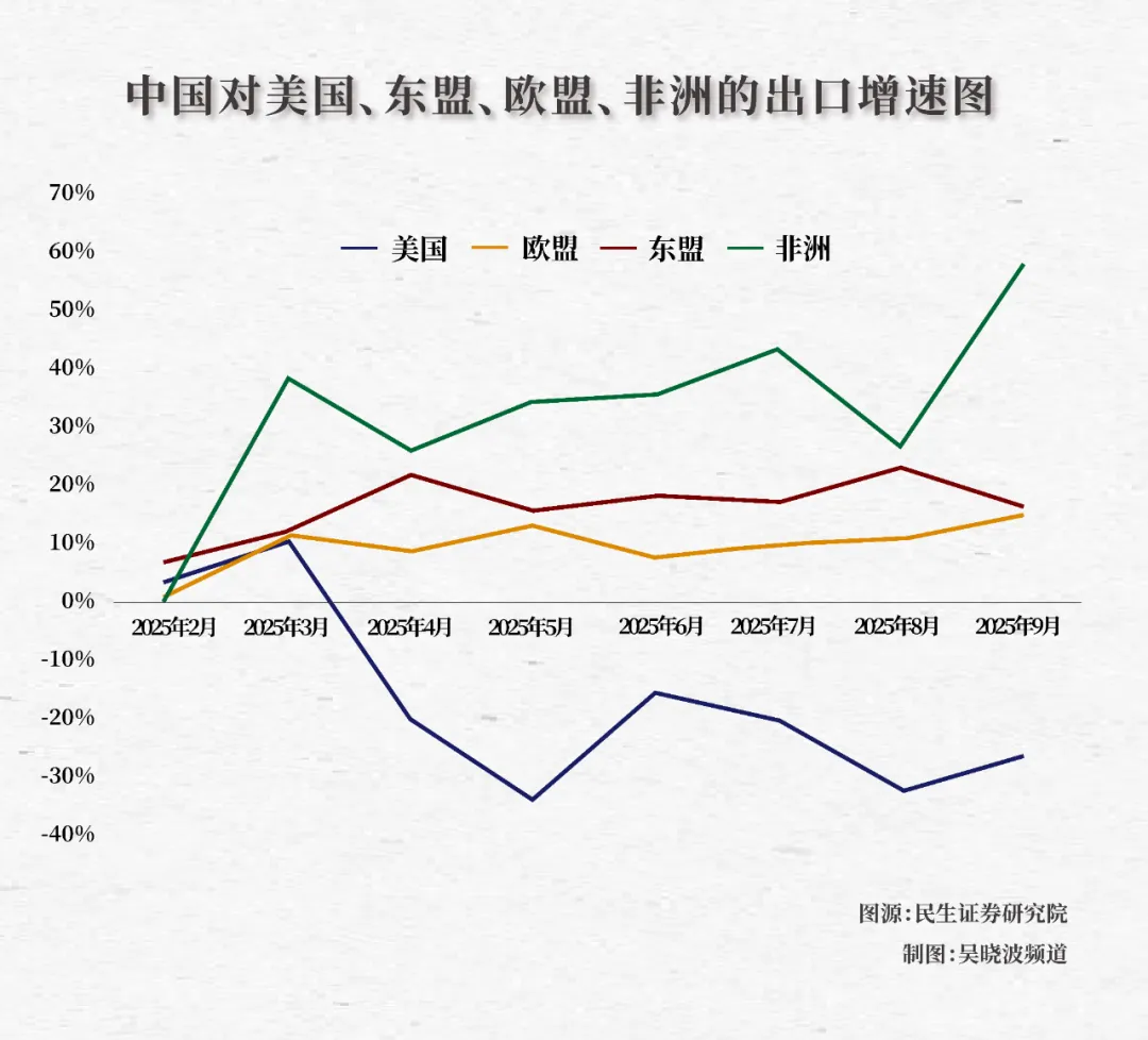 单看9月,中国对美国出口减少27%,是自4月以来连续第6个月负增长。相应地,对欧盟、东盟的出口则持续保持增长,其中,对越南出口增长了25%。