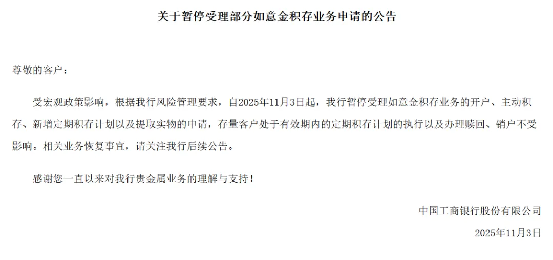 比如工商银行在11月3日上午发布公告称,受宏观政策影响,根据工商银行风险管理要求,自2025年11月3日起,工商银行暂停受理如意金积存业务的开户、主动积存、新增定期积存计划以及提取实物的申请。