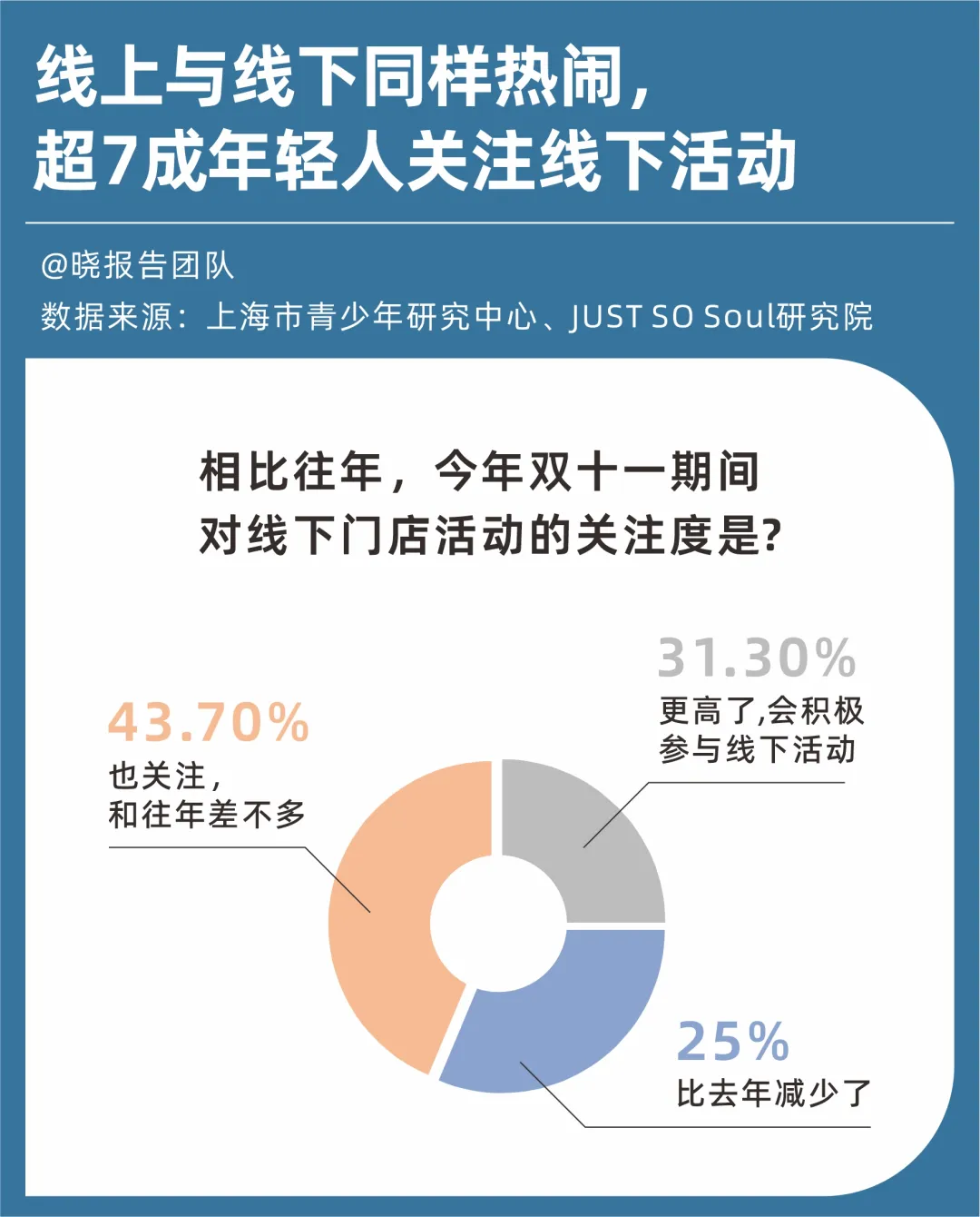 上海市青少年研究中心和JUST SO Soul研究院的调研数据显示,超七成年轻人会关注线下活动,其中31.3%的年轻人在双十一期间,对线下门店活动的关注和参与程度更高了。