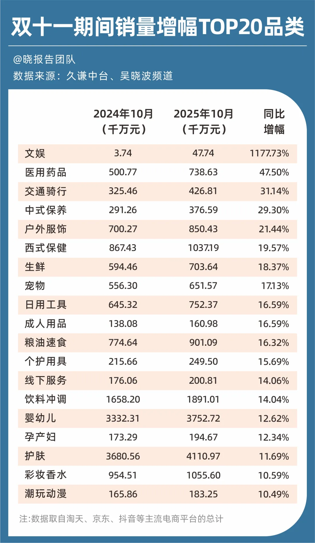 位列其后的,是增长表现稳健的医用药品、交通骑行、中式保养、户外服饰、西式保健等品类,它们共同勾勒出一幅“精打细算地追求生活品质”的消费群像。