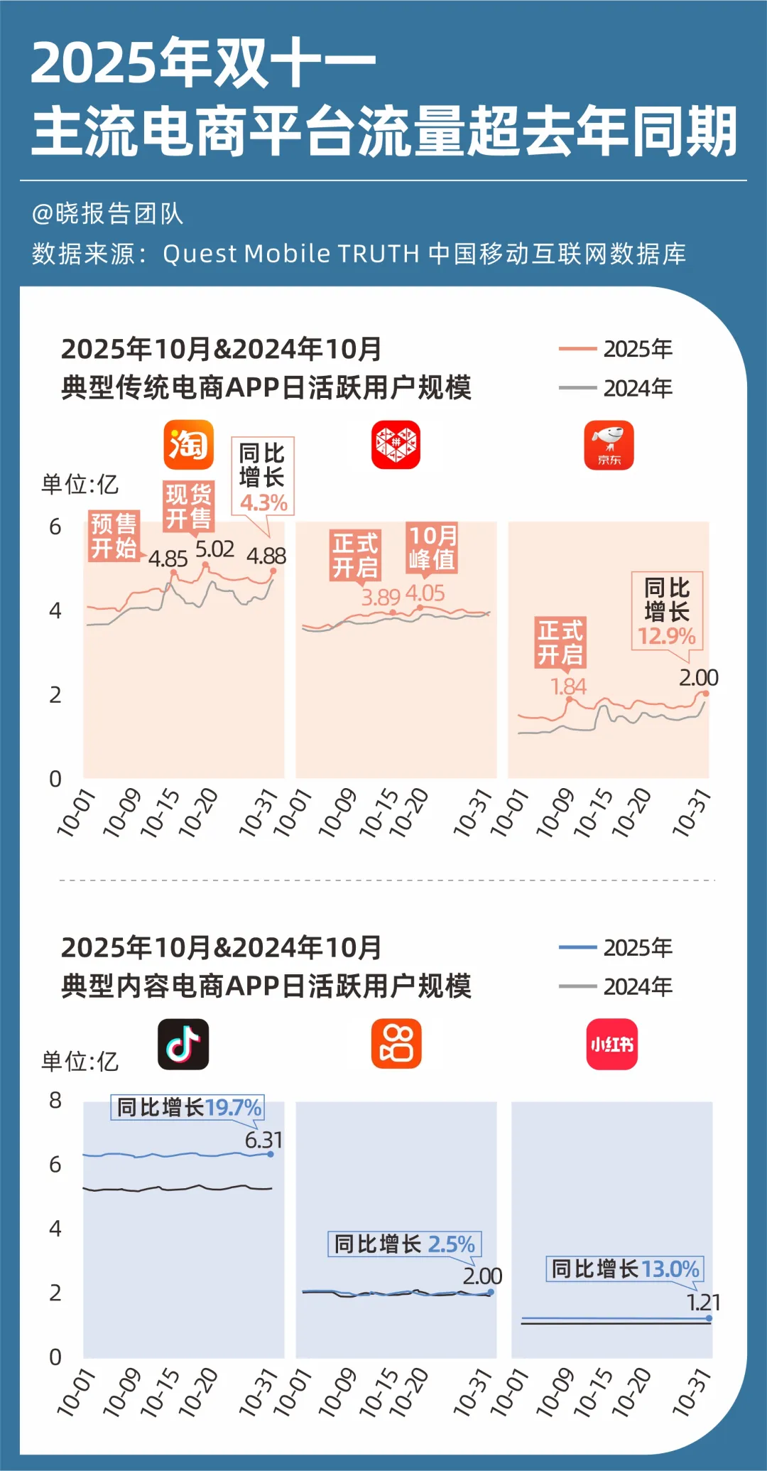 “闪购大战”的势能就此延续到了双十一,为主流电商平台带来了新增量:今年10月,双十一刚开幕,淘宝平台日活用户4.88亿,同比增长4.3%。“京东”也收获了不错的成绩,10月平台日活用户同比增幅达到12.9%。