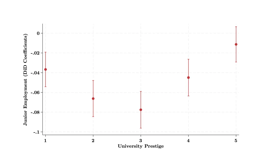 简而言之,生成式AI对就业的冲击并非均匀分布,而是精准指向初级岗位的“缩招”。