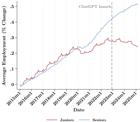 2015—2022年,初级与资深员工岗位同步增长;从2022年中开始,分化趋势出现了:资深岗位持续攀升,而初级岗位先停滞,后下滑——这一转折,与ChatGPT等生成式AI的爆发高度吻合。