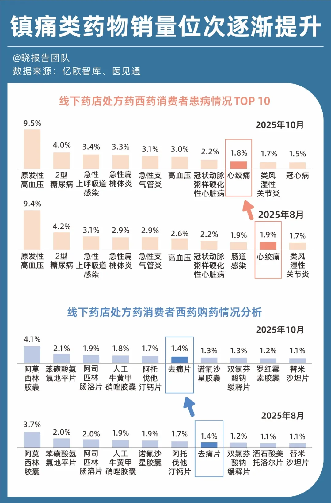 最直观的就是关于止痛、镇痛类的药物销售在不断增加。亿欧智库与医见通的最新数据显示,2025年8—10月,药品“去痛片”的销量位次逐渐提升;在线下药店购买处方药西药的消费者中,患“心绞痛”的占比位次也在逐渐提升。