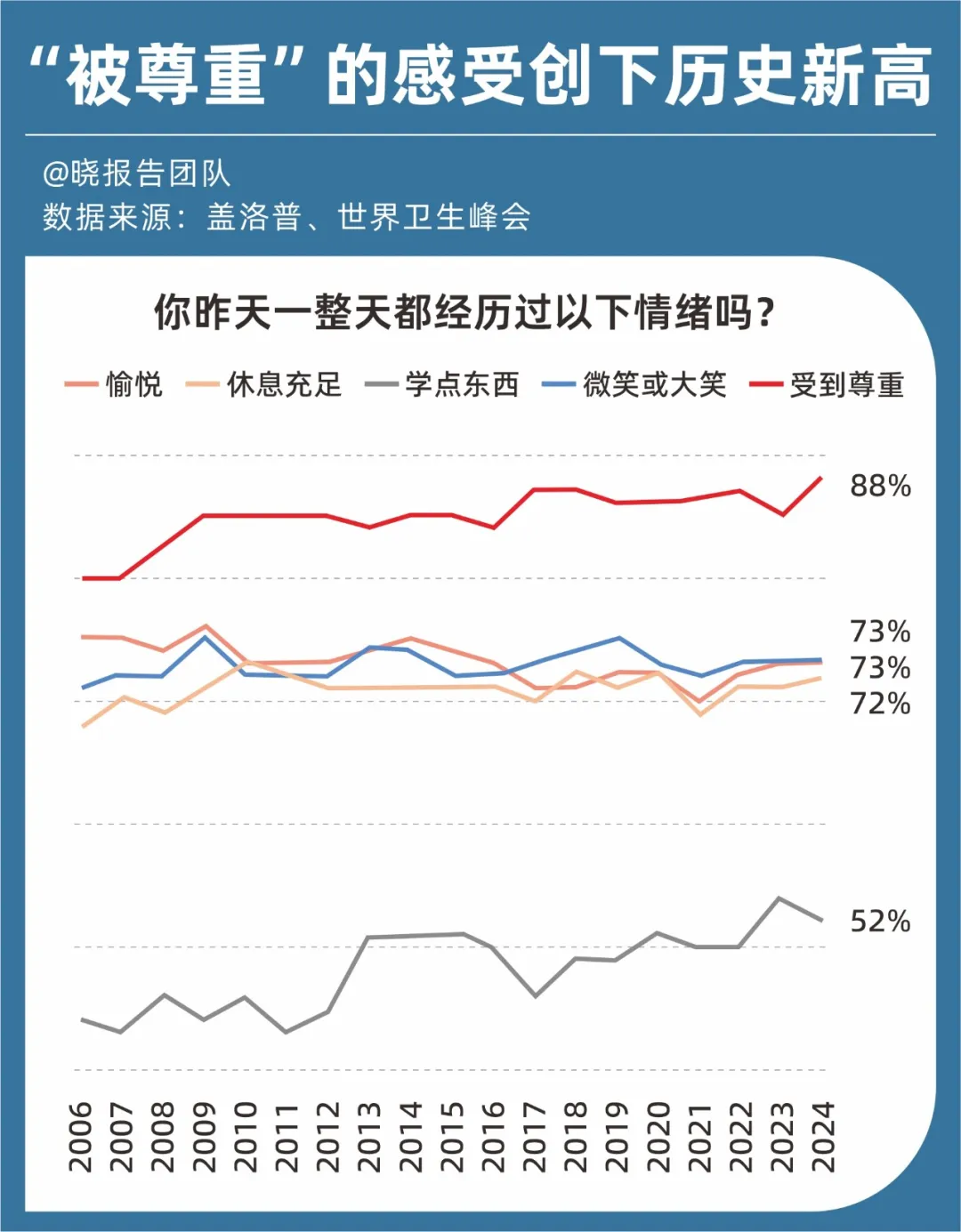盖洛普与世卫组织的报告还揭示了一个更重要的发现:2024年,愉悦(73%)、微笑或大笑(73%)等正面情绪维持在长期平均水平,而“被尊重”的感受更是达到了88%的历史新高,比2023年高了3个百分点。