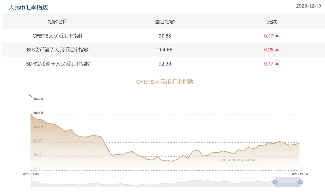 指数的走弱,意味着尽管人民币对美元出现了大幅度升值,但是对于其他国家的货币,比如英镑、欧元等一篮子外国货币而言, 其整体价值水平是在下降的。