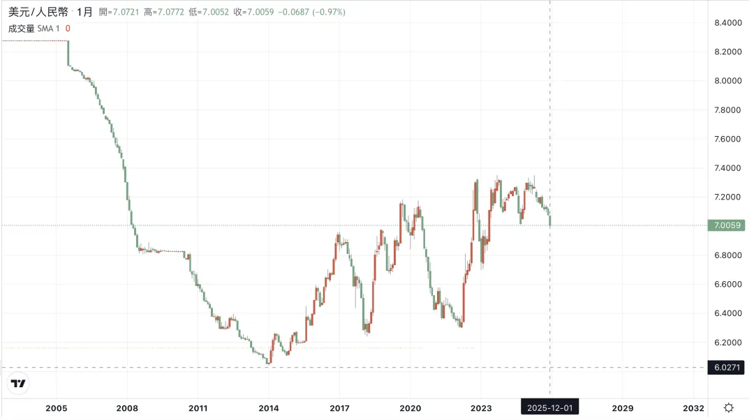 2005—2025美元/人民币走势