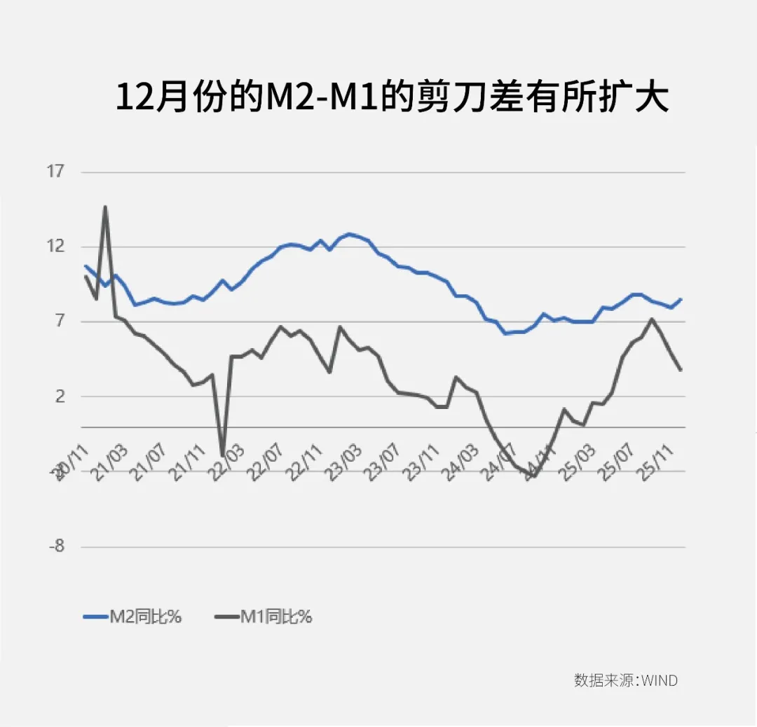 另外一个数据也可以进行佐证。1月15日,央行发布去年12月份最新的社融数据,数据显示,12月份的M2-M1的剪刀差有所扩大,非银存款大幅度减少,住户存款则逐渐增多。