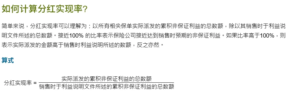 当然,由于是“非保证”,所以香港保险业使用了一个叫做“分红实现率”的指标,来衡量保险公司实际派发的非保证分红与销售时演示金额的比值。