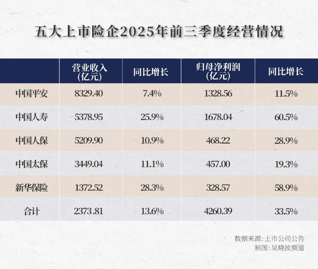 2025年前三季度,A股市场五大上市保险公司合计归母净利润高达4260亿元,同比增长33.5%。