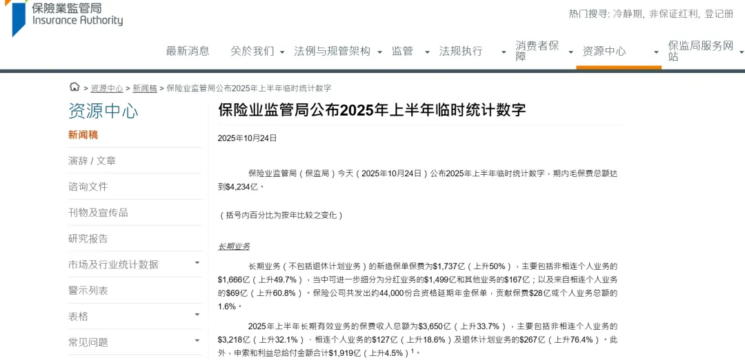香港保险业监管局的数据显示:2025年上半年,香港新造保单保费为1737亿港元,同比增长高达50.5%。2024年全年,内地访客投保占比达29%。这意味着,每三张港险保单中,就有一张来自内地客户。