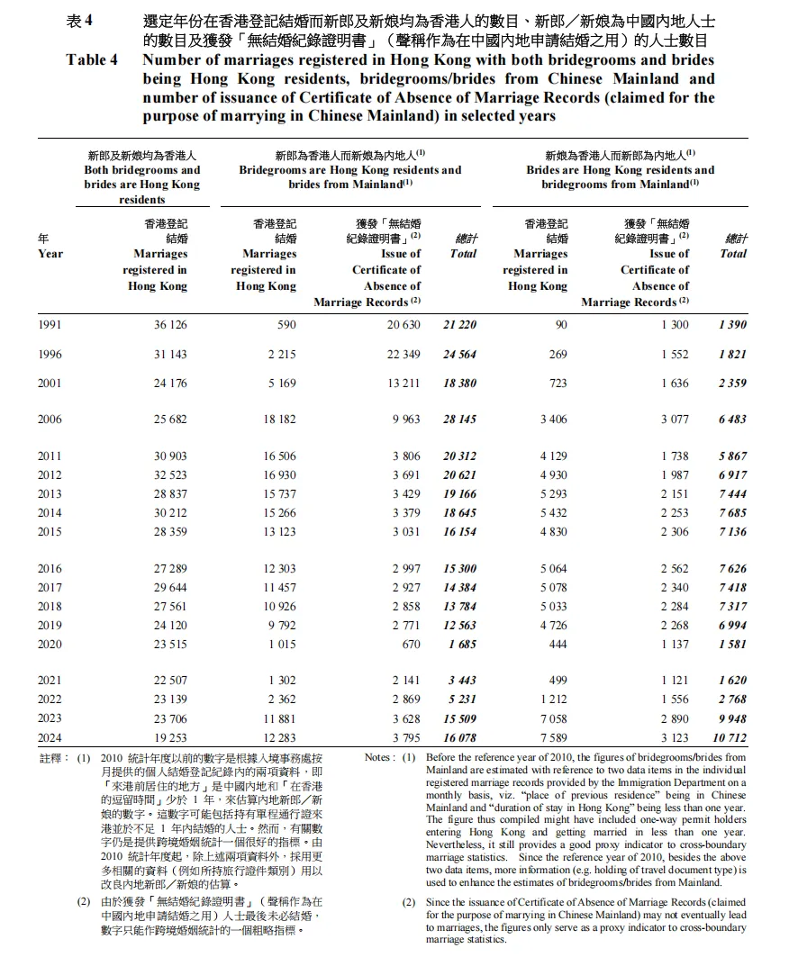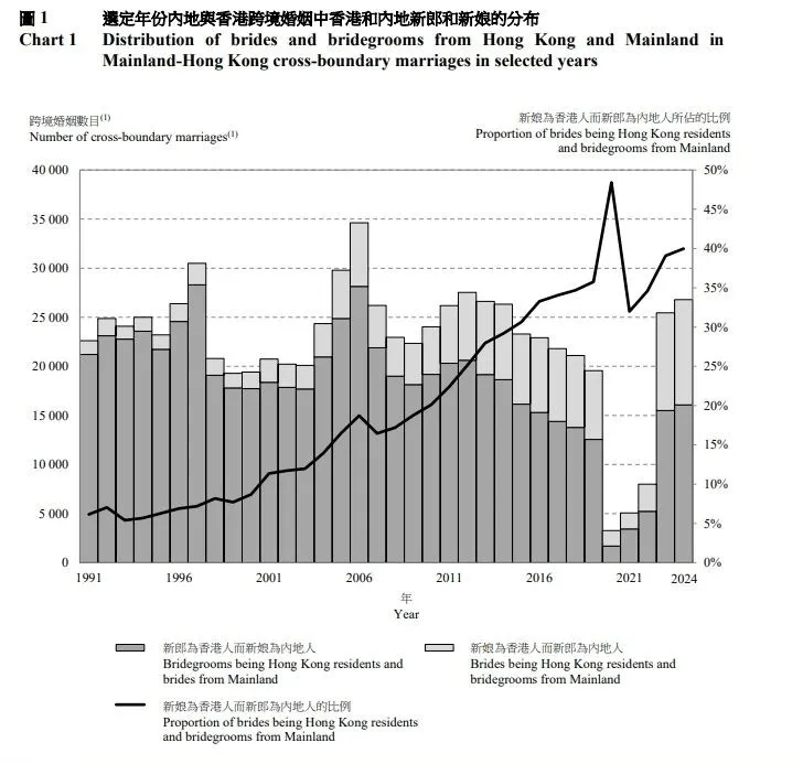 近日,香港特区政府发布2026年1月号《香港统计月刊》,系统梳理了1991年至2024年间逾30年的跨境婚姻数据,清晰呈现了香港与内地婚姻关系的演变轨迹。
