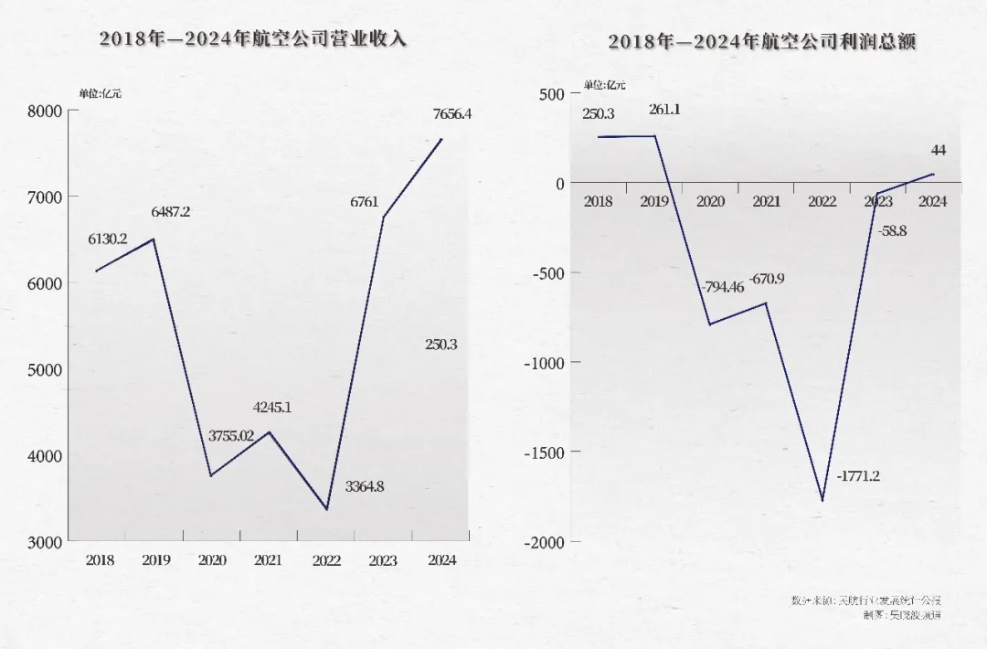 从图中可以看出,早在2023年,航空公司的营收就已经回到了疫情前的水平,然而,利润虽然也在回升,但直到2024年,利润总额仍不及疫情前的1/5。