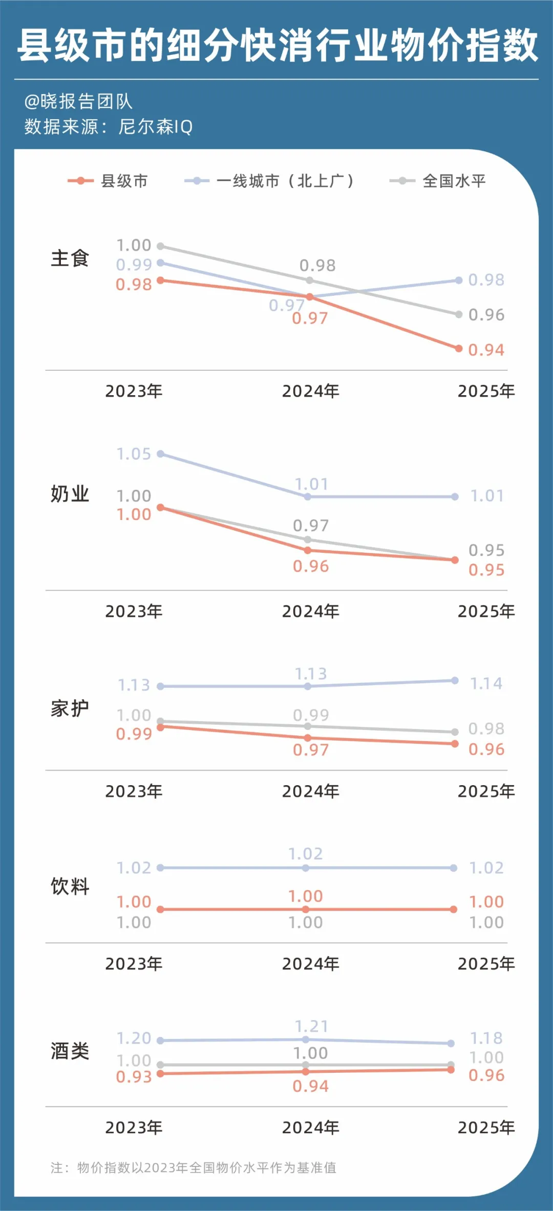 尼尔森IQ的数据显示,在2023—2025年间,县级市的主食物价指数下降4个百分点,奶制品物价指数下5个百分点,家护品物价指数下降3个百分点。而饮料堪称定价界的“老实人”,一瓶快乐水,无论在大都市还是小县城,身价基本稳定。
