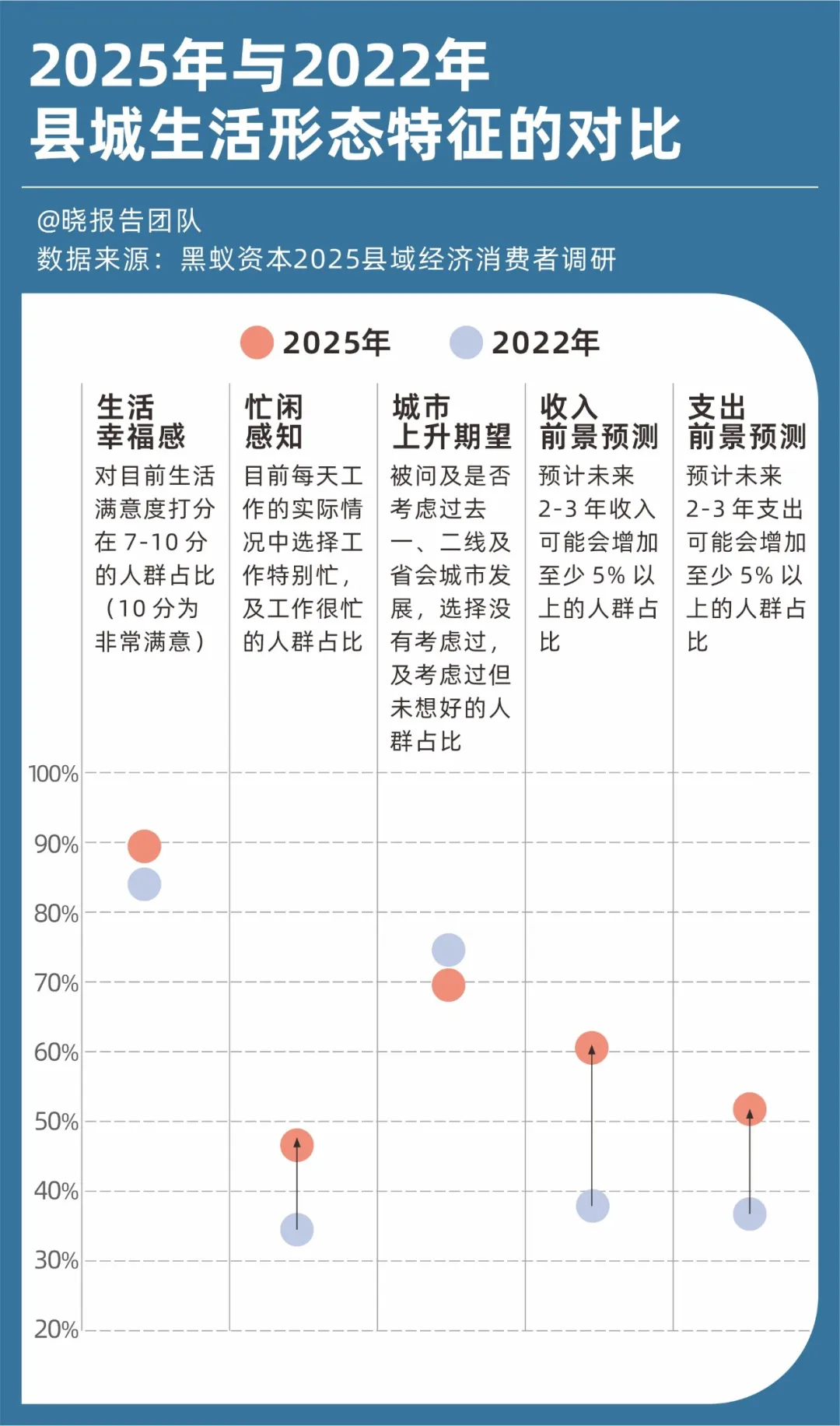 黑蚁资本的调研发现,2025年,近60%的县域受访者预计收入将增长5%以上,这一比例相比2022年增加了近20个百分点。