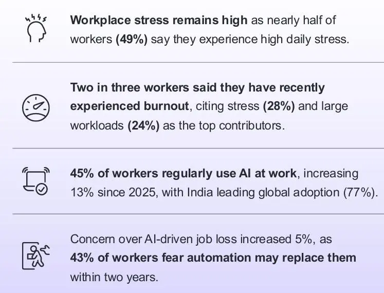 Manpower Group发布的《2026全球人才晴雨表》显示,过去一年,定期使用AI的打工人同比增长了13个百分点,达到45%。