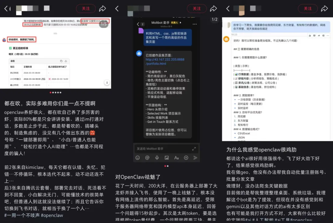 社交媒体上已经是铺天盖地的吐槽:“烧了上千元、浪费了几个晚上的时间,最后发现不如自己干”;“训练龙虾花的时间精力和金钱,够招好几个实习生,还能帮我下楼买咖啡”。