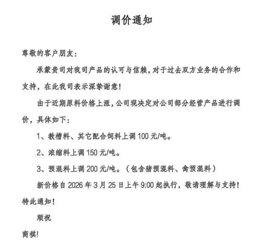 某品牌饲料宣布涨价