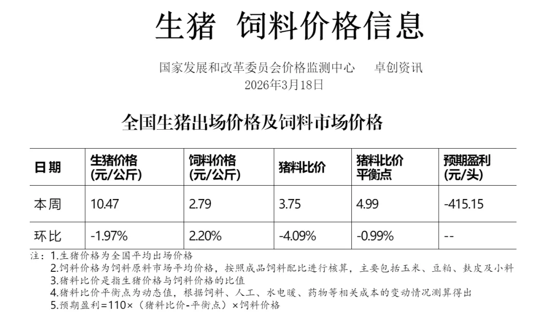 3月23日,国家发改委监测信息显示:生猪养殖预期亏损415.15元/头。