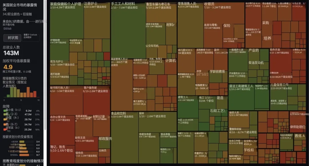 OpenAI 联合创始人Andrej Karpathy对美国342个职业做了一次AI替代风险暴露度评分,发现有41%的劳工落在高风险区,其中财务、文员、信息服务等是重灾区。