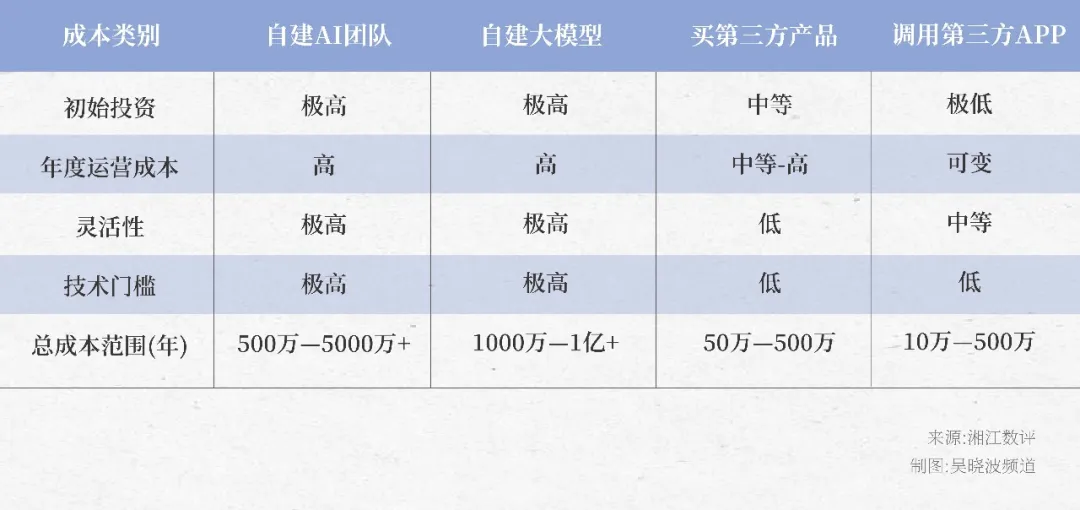 搭建AI基础设施需要大量资金投入。举例来说,如果要自建AI团队,企业需要采购GPU、服务器、传感终端、数采设备、数据及数据处理服务等,再组建一个人均年薪50—100万、3—5人的核心工程师团队,成本轻易上千万。