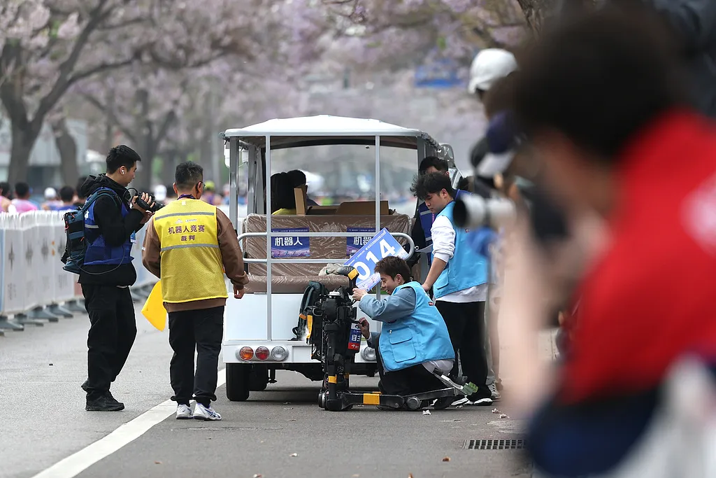 一年前,21台参赛机器人里只有6台跑完全程,冠军天工机器人换了三次电池、摔倒一次,最终花了2小时40分钟抵达终点,比人类组冠军慢了一个半小时。