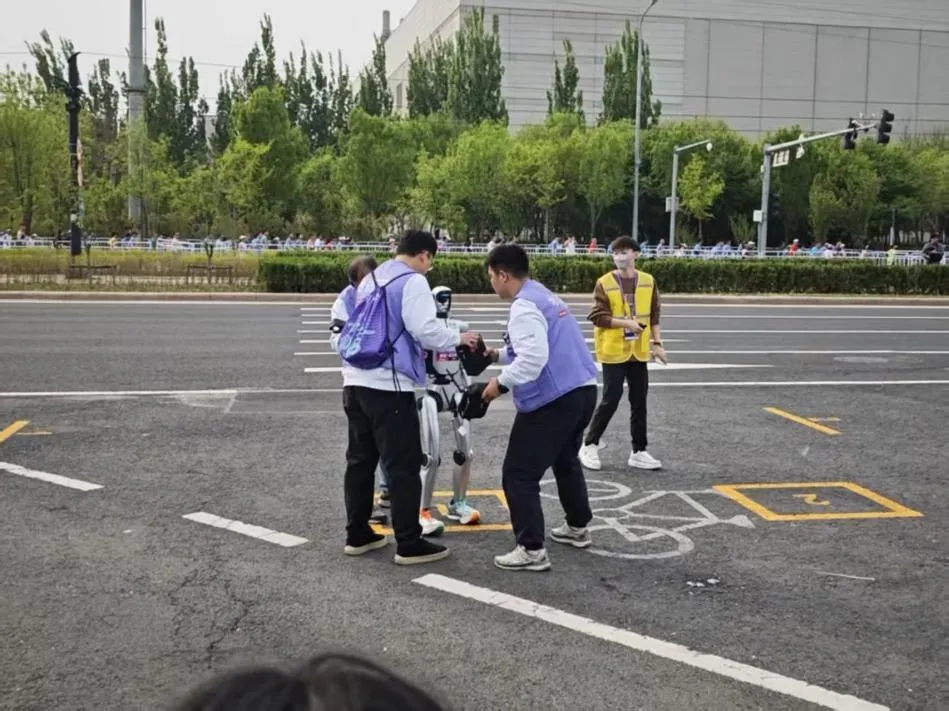 宇树一共派出3个队伍,全为自主导航,使用的是微调过的2023年老机型H1。机器人在终点附近失控摔倒,被担架抬走,最终未能完赛。