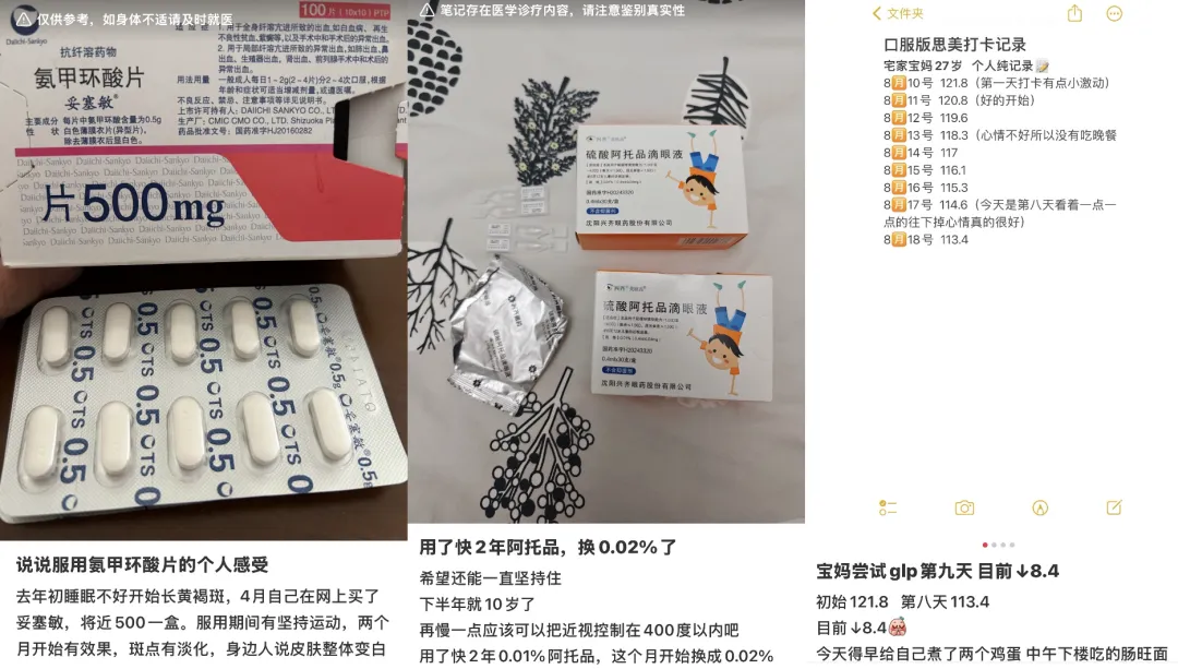 “温和戒烟,乐速克打卡第21天”“使用米诺地尔2年,防脱效果总结”“家里近视娃,每个月必配阿托品”……社交平台上,不少网友分享着“用药攻略”。