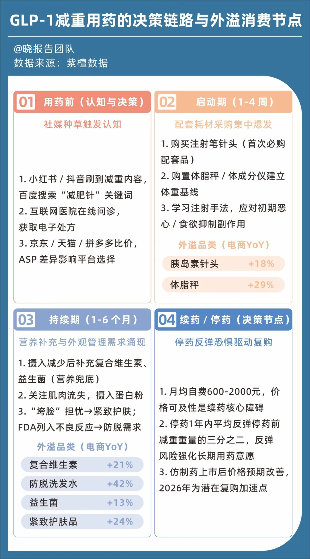 紫檀数据指出,在GLP-1类减重药的持续使用阶段,出现的肌肉流失、“司美脸”,乃至FDA不良反应,将外溢出蛋白粉补充、防脱洗发水、紧致护肤品等需求。停药阶段出现的反弹风险,更是会强化消费者的长期用药意愿。