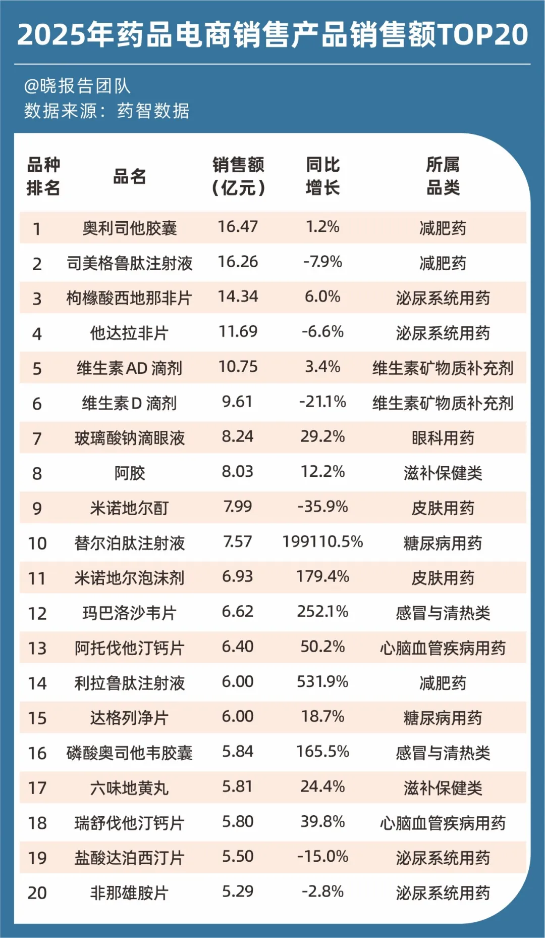 根据中康数据,截至2025年8月,O2O药品市场规模达291亿元,同比增长29.6%,增速显著。药智数据进一步显示,上榜2025年药品电商销售额TOP20的药物,正是集中在减肥、男科、降糖降脂、抗病毒、心脑血管等领域,而这些与大众亚健康状态密切相关。